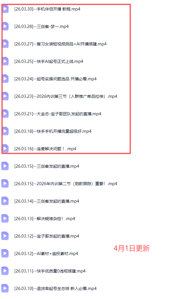 ├──[26.03.16]–连麦解决问题 !.mp4 1.00G - ├──[26.03.18]–快手手机开播流量超级好.mp4 490.66M
