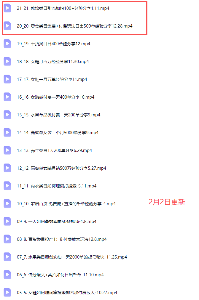| ├──19_19. 干货类目日400单经分享12.mp4 27.15M - | ├──20_20. 零食类目免费+付费玩法日出500单经验分享12.28.mp4