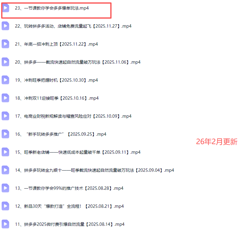 - ├──22、玩转拼多多活动,店铺免费流量起飞【2025.11.27】.mp4