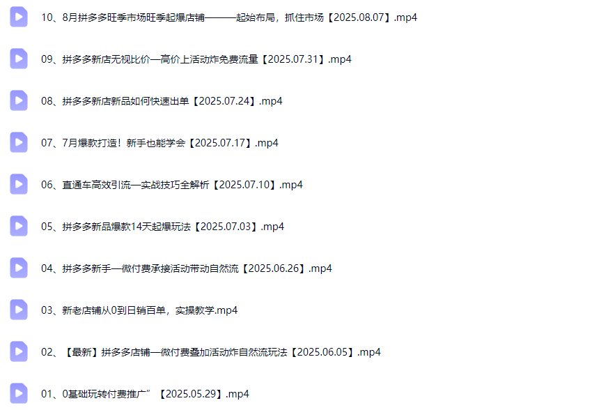 ├──08、拼多多新店新品如何快速出单【2025.07.24】.mp4 424.77M