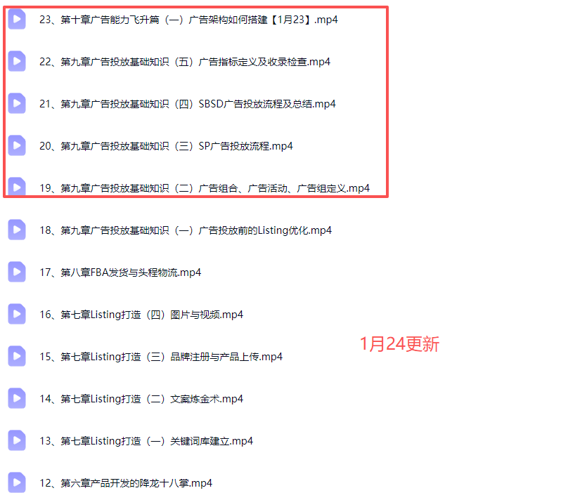 ├──18第九章广告投放基础知识(一)广告投放前的Listing优化.mp4 388.02M - ├──19、第九章广告投放基础知识(二)广告组合、广告活动、广告组定义.mp4