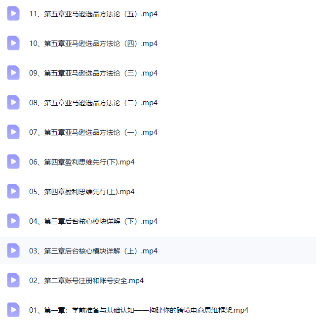 - ├──01、第一章:学前准备与基础认知——构建你的跨境电商思维框架.mp4 622.27M