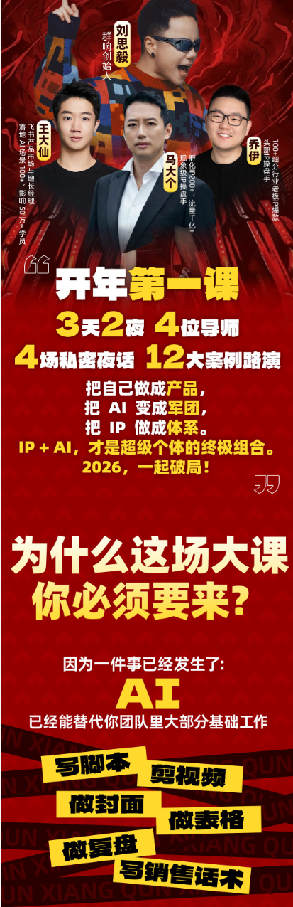 把自己做成产品把 Ai变成军团把IP 做成体系。IP+Al,才是超级个体的终极组合。2026,一起破局!