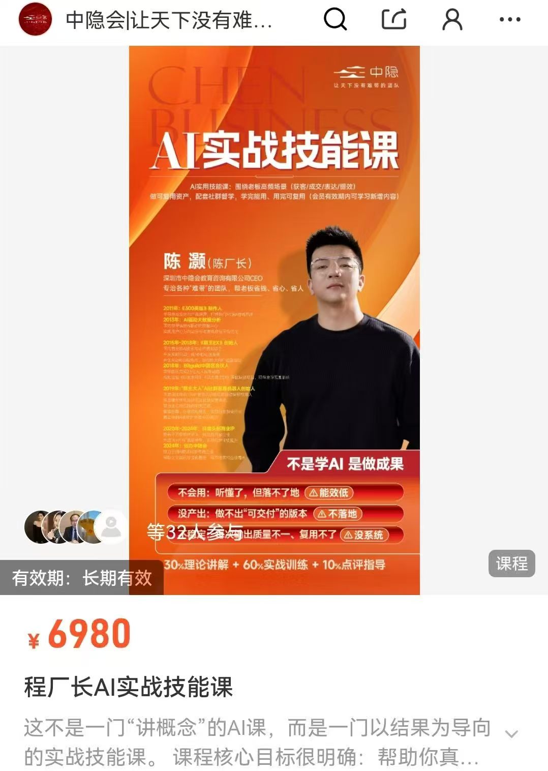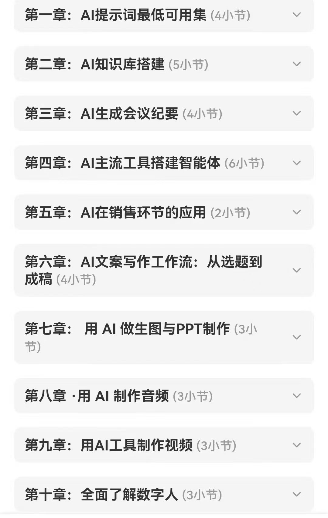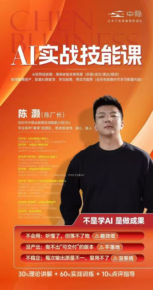 - 这不是一门”讲概念”的AI课,而是一门以结果为导向的实战技能课。课程核心目标很明确:帮助你真正掌握AI领域的核心能力,把AI从”听懂了”变成”能用,能做,能交付,能复用”。无论你是个人想提升能力,还是企业想把AI用进业务,这门课都能帮你快速建立一套可落地的方法和执行路径。很多人学AI会遇到这几个问题:听懂了但用不出来,做不出可交付成果,每次输出不稳定,无法复用到工作里。这门课就是围绕这些问题来设计的不是教你”知道A I”,而是教你用AI做成果。课程采用30%理论讲解+60%实战训练