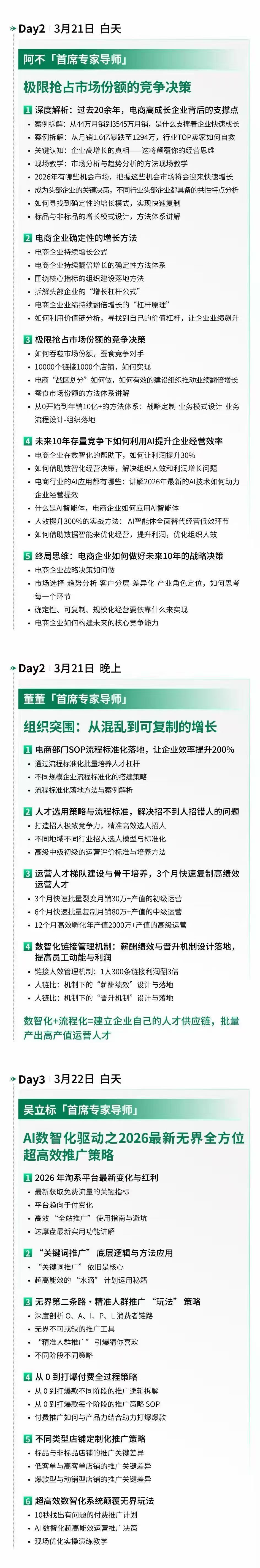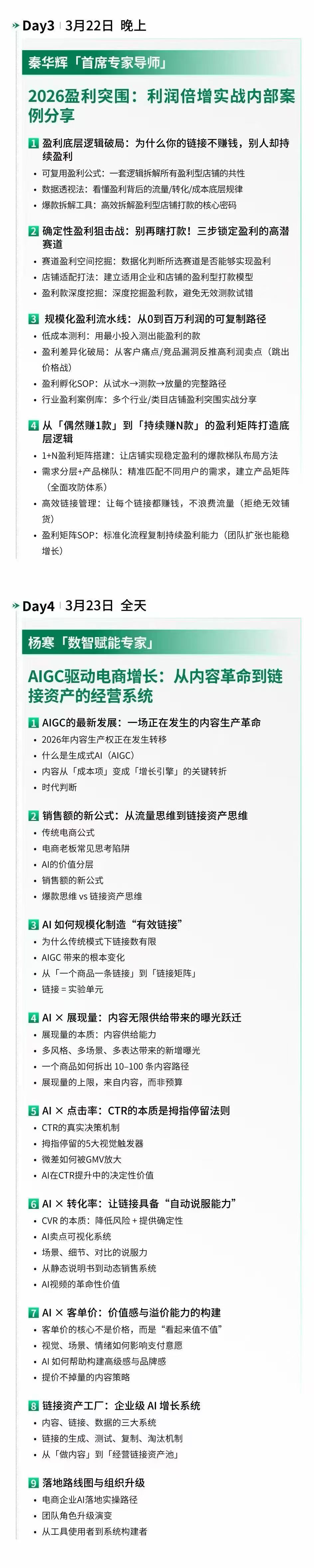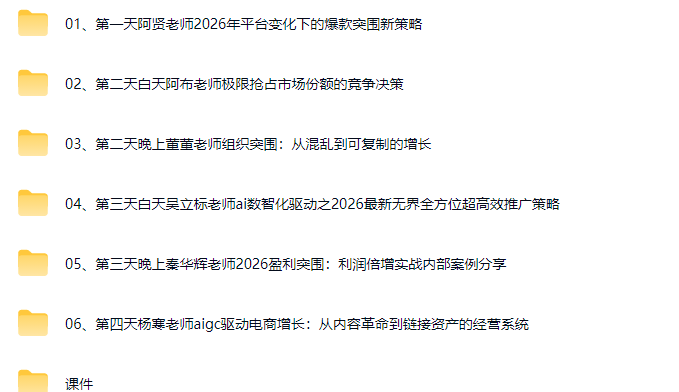 - 2026年3月20日-23日261期杭州开课,七位领队导师,内容覆盖直播带货,选品,流量,团队搭建,AI提效,品牌战略等,从零基础到进阶全搞定!