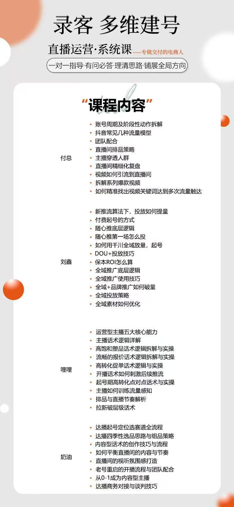 付总:30+类目账号从0起号,单场流量破10万+,80%学员7天流量过万;刘鑫:千万级投流操盘手,千川/随心推ROI稳超3+,专治投流亏空;哩哩:单场GMV500万+直播间推手,话术直接复用,转化平均提30%;